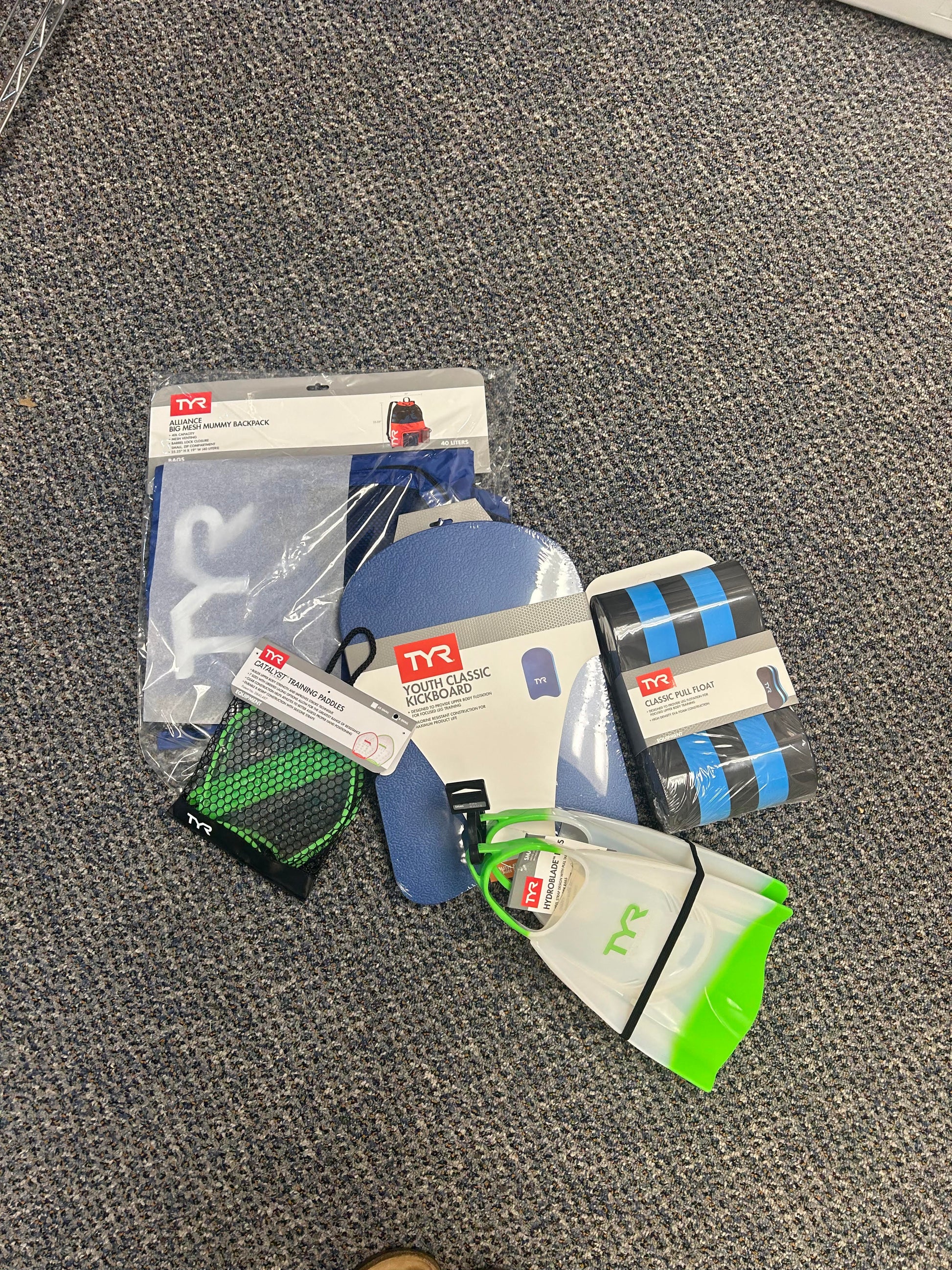 Includes fins, buoy, youth kickboard, paddles, mesh bag.